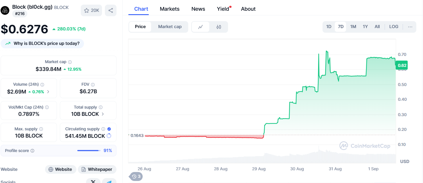 Block (Block) cotitza a 0,65 dòlars, fins a gairebé el 294% durant la setmana passada. El token ha experimentat un fort augment després de colpejar un mínim de 0,11 dòlars a l’11 d’agost, guanyant més del 500% des de llavors. Malgrat aquesta manifestació, es manté un 62% per sota del màxim de 1,80 dòlars, assolit el juny de 2025.