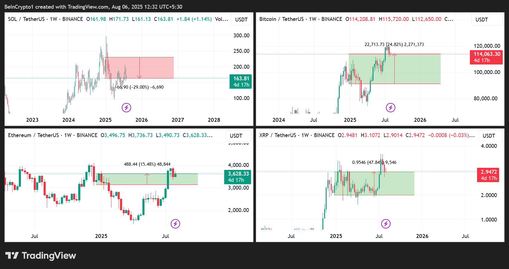 Sol/USDT, BTC/USDT, ETH/USDT i actuacions de preu XRP/USDT. Font: TradingView