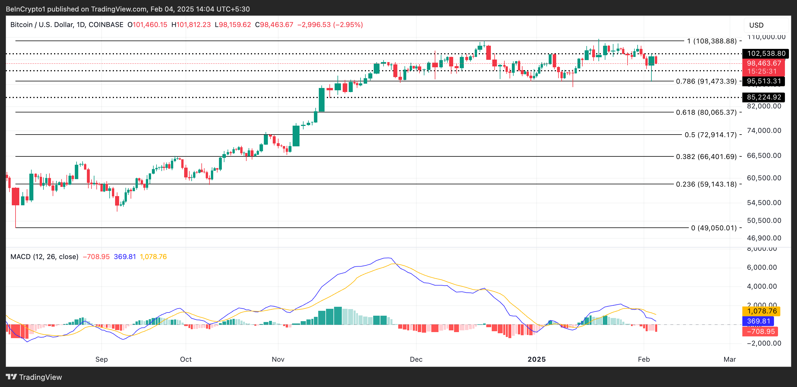 Actualment, BTC cotitza a 98.463 dòlars, lleugerament per sota de la resistència crucial formada en 102.538 dòlars. Si bé el canvi de política de Trump ha desencadenat una onada d’acumulació entre els comerciants, les lectures de la divergència de convergència mitjana mòbil de la moneda (MACD) suggereixen que la pressió baixista continua sent forta.