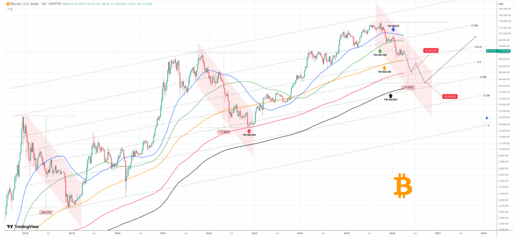 Els nivells tècnics clau destacats inclouen un potencial mínim intermedi proper als 47.000 dòlars, alineat amb la mitjana mòbil (MA) de 350 setmanes, i un objectiu a la baixa més profund al voltant de 38.000 dòlars prop de la mitjana mòbil de 500 setmanes. Aquests nivells són coherents amb els fons del cicle anterior, on les mitjanes mòbils a llarg termini van actuar com a zones de suport crítiques.